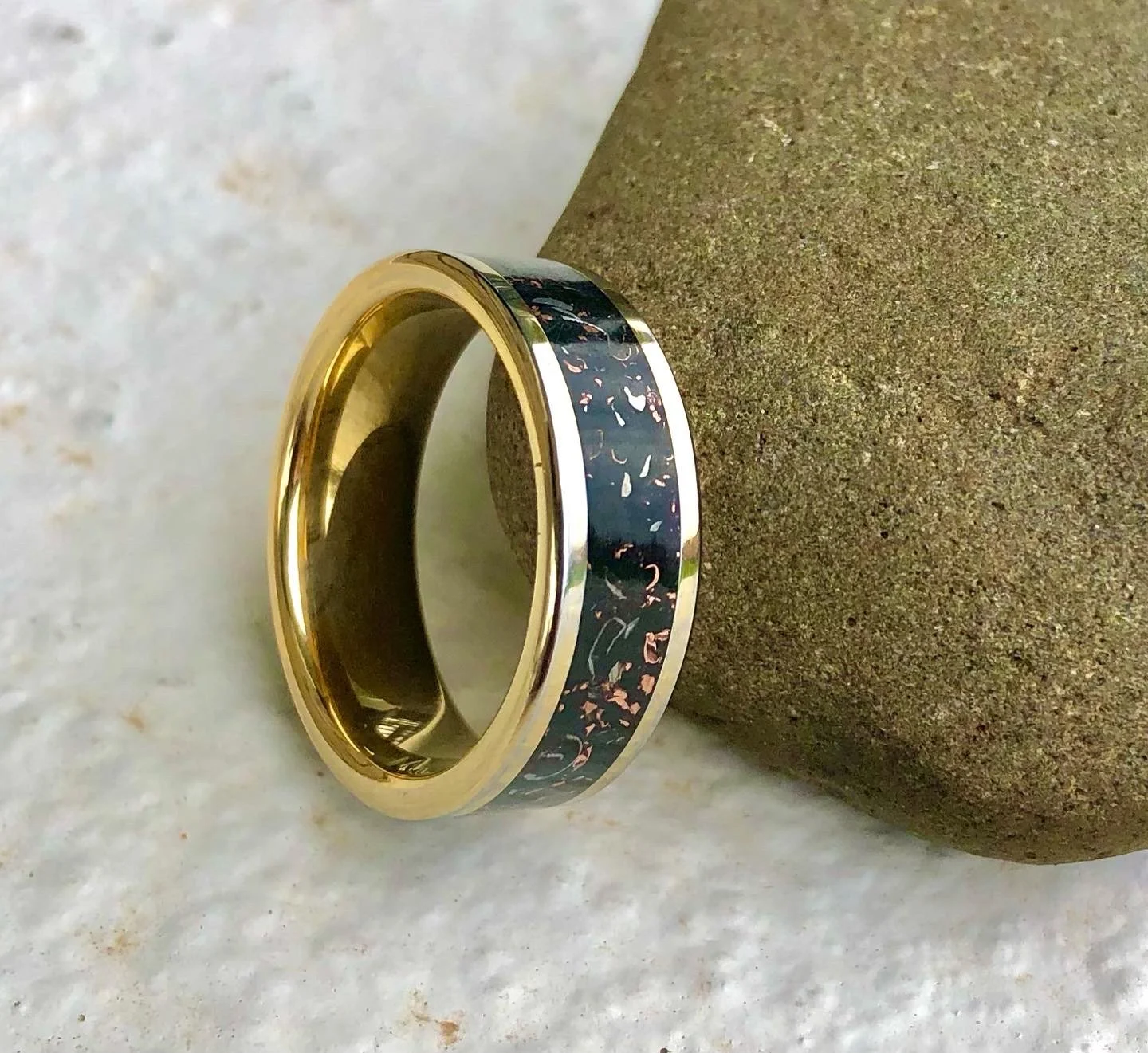 I started making wooden rings as a hobby in the fall of 2016. After beginning with different types of wood, I expanded into materials like Carbon Fiber, Stainless Steel, Titanium, and Tungsten Carbide. I have since started utilizing materials such as synthetic resin, acrylic, ceramic and antler in the creation of my rings. Originally, I used natural materials like Turquoise and other semi-precious stones as inlay materials. I have expanded to an even wider variety of natural and synthetic materials to inlay into the rings. These materials range from precious and semi-precious stones, synthetically created Opal in a large variety of colors, and sand from different beaches around the word to meteorite, silver wire, gold leaf, color pigments and glow-in-the-dark powders of different colors.